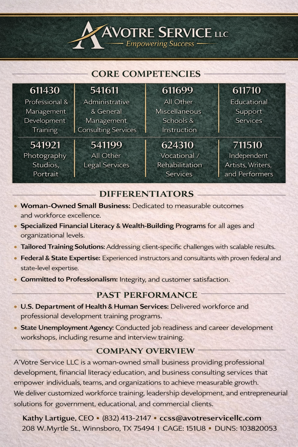A'Votre Service LLC helps organizations and independent professionals strengthen operations, job readiness, leadership, and long-term growth through tailored consulting and practical training.